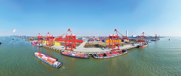 临近年底,各地生产企业、物流枢纽一派繁忙景象,奋力冲刺全年目标任务。图为12月24日拍摄的江苏省扬州港集装箱码头(无人机全景照片)。