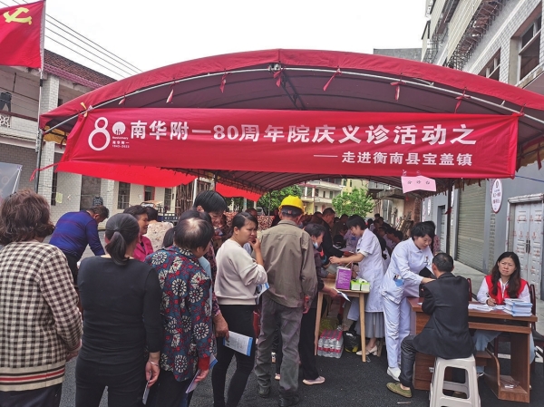 两年来,医院开展的健康义诊行动已覆盖衡阳市七县五区,并拓展至娄底、邵阳、郴州、永州等地,惠及民众3万余人。针对区域内的多发病、常见病,医院组织以主任医师、副主任医师为主的医疗队开展义诊,为居民提供多种疾病的免费诊疗、检查检验和健康咨询服务,使用移动CT、移动B超对潜在疾病进行早诊早治;提供穴位贴敷、铜砭刮痧、睡眠障碍、耳穴压豆等中医康复治疗;免费发放药品,开展合理用药指导;通过健康宣教和疾病预防知识普及,增强群众卫生健康意识,培养健康生活方式;针对一些身患特大疾病且行动不便的特殊困难群众,组织专家走村入户、上门看病、送医送药,为农村群众解决疼痛顽疾。第十九党支部(急诊支部)为困难山区群众巡医送药的事迹,被央视新闻频道《朝闻天下》栏目报道,2024年该支部被国家卫生健康委选树为全国公立医院临床科室标杆党支部。