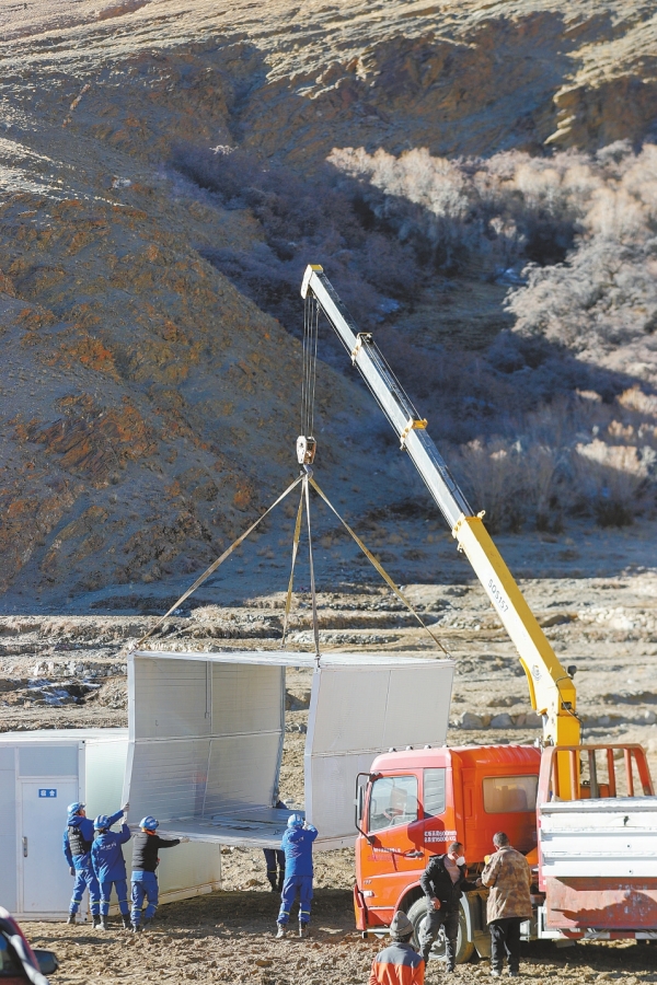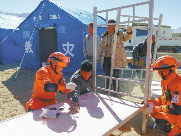 1月8日,在定日县长所乡古荣村安置点,救援人员在搭建临时安置板房。