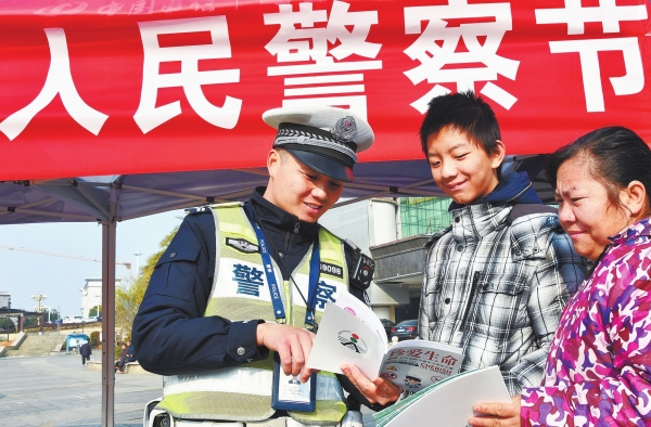 1月10日,江永县公安局交警大队民警向市民发放宣传资料,讲解交通安全知识。当天是第五个中国人民警察节,我省各地开展形式多样的活动庆祝节日。