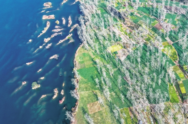 1月10日,中方县中方镇毛田村,河流、树木、田园、小岛相互映衬,勾画出一幅醉人的冬日画卷。