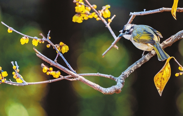 1月10日,湖南烈士公园种植的蜡梅娇艳绽放,吸引鸟儿闻香而来觅食、嬉戏,为冬日增添一抹靓丽色彩。
