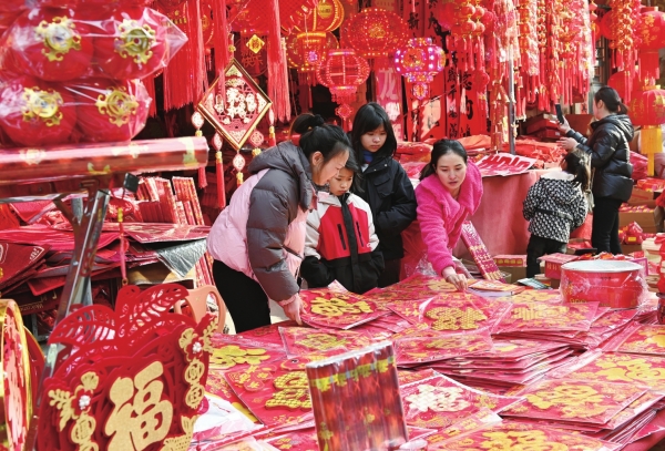 1月13日,武冈市水西门街道某贸易市场,顾客在选购春节饰品。春节临近,该市年货市场物丰价稳,前来置办年货的市民络绎不绝。