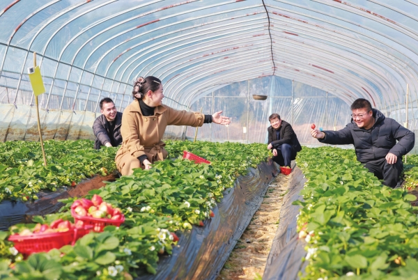 1月12日,东安县井头圩镇霞栖村草莓种植基地,游客在采摘草莓。春节临近,这里的草莓进入丰产期,吸引游客前来乐享采摘之趣。