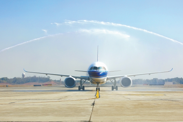 湖南日报1月17日讯(全媒体记者 于淼 通讯员 曹弋远 欧阳婷)1月17日12时8分,搭载147名旅客的南航CZ3380(广州-长沙)航班平稳降落长沙黄花国际机场,国产大飞机C919在湖南顺利完成飞行首秀。这是春运期间南航C919新增的首条航线,长沙机场成为国产大飞机的又一通航机场。