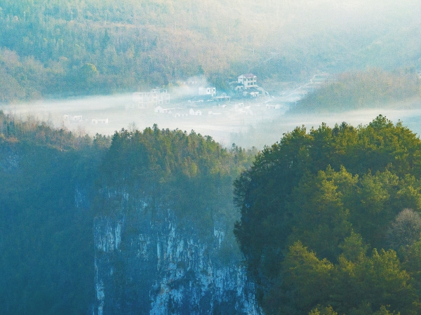 1月19日,峡谷里的凤凰县禾库镇吉乐村薄雾氤氲,在冬日晨曦暖阳的照耀下静谧迷人。