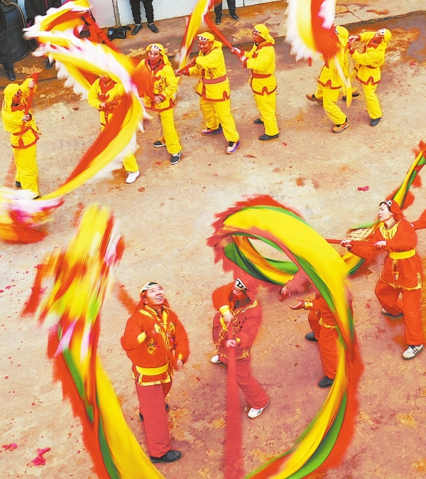 2月1日,嘉禾县龙潭镇龙兴村,村民在进行舞龙表演。春节期间,该村村民通过舞龙巡游的形式,热热闹闹庆贺新春。