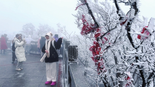 2月1日,大年初四,张家界天门山迎来蛇年新春的首场降雪。海拔1500多米的天门山顶,千树万树雾凇花开美如画,游客登高赏雪,欢度假期。