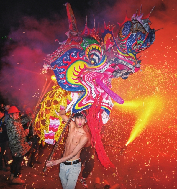 2月12日晚,吉首市马颈坳镇举行一年一度的“钢火烧龙”非遗民俗展演。