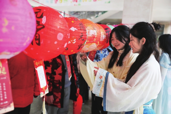 2月12日,新田县云梯学校,学生在猜灯谜。当天是元宵节,我省各地举办丰富多彩的活动,欢庆元宵佳节。
