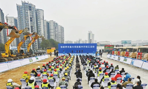 2月18日,张家界天门山索道下站旅游服务综合体施工现场车辆穿梭、工人有序作业,建设正酣。该项目总投资15.71亿元,去年12月26日作为全省重大项目正式开工。