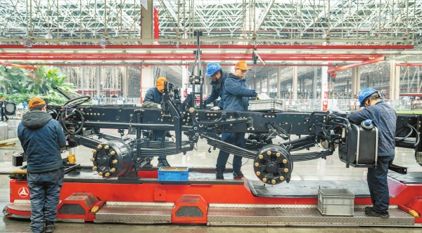 2月19日,长沙经开区三一智联重卡产业园的重卡智能制造车间,工人在生产线上忙碌。新春复工以来,该车间工人开足马力赶工备货,迎接行业旺季。