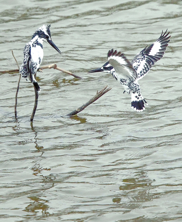 2月19日,长沙市望城区丁字湾街道,斑鱼狗在水面嬉戏。斑鱼狗全身长着黑白相间的斑点,与斑点狗的毛色有异曲同工之妙。斑鱼狗(鸟类)以吃鱼为生,之所以被称为“狗”,是因为它捕鱼凶猛如狗。