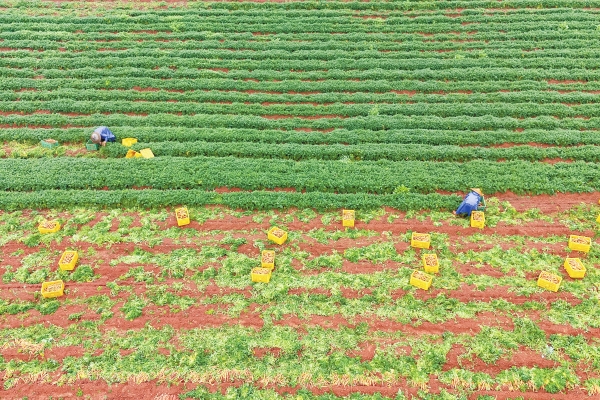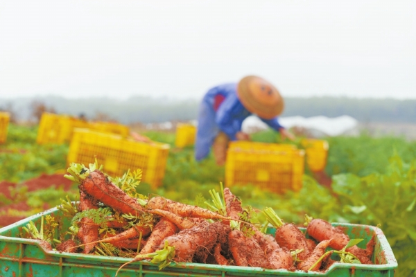 2月20日,永州市冷水滩区伊塘镇蔬菜种植基地,村民在采收胡萝卜。近年来,当地依托资源优势,大力发展玉米、胡萝卜、芥菜、藠头等特色农作物规模化、标准化种植,提高土地产出效益,促进农业增效、农民增收。