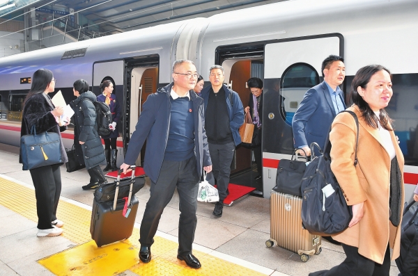 湖南日报北京3月3日电(全媒体记者 刘燕娟 郭宸)3日下午,出席十四届全国人大三次会议的部分在湘全国人大代表乘高铁抵达北京,向大会报到。全国人大代表沈晓明、王双全、胡旭晟、杨维刚、朱玉等同车抵达。
