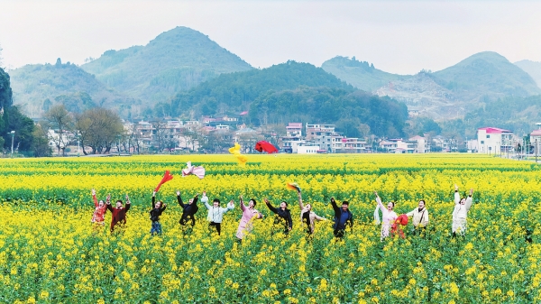 3月7日,东安县新圩江镇芦江村,成片油菜花竞相绽放,吸引不少游客前来赏花休闲。