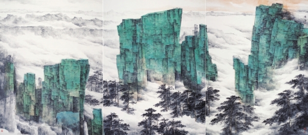 具体到笔法,旷小津经探索形成独特笔墨语言体系。山石的处理,具有当代性,有别于传统,却又源于传统,观众能从画中寻其根。在章法上,有时也有所突破,和传统山水画拉开了距离。在画面透视上,他强调焦点透视,很多构图借鉴现代的高科技,比如摄像机的各种视角。它把现代科技和传统融为一体。这是传统的当代化转化,转化得很巧妙。换言之,旷小津坚守笔墨精神的特点是融入了现代构成的理念和视角,展现了独属于中国人的浪漫,又寻找到了现代人的精神归属。