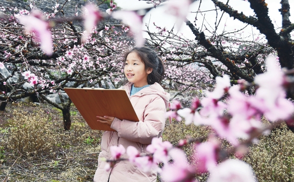 3月16日,江永县兰溪瑶族乡香花井村,小学生在写生。眼下,该村万亩桃花竞相绽放,游客纷纷前来游玩。