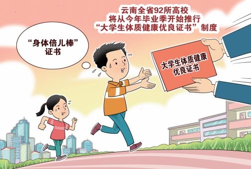 云南省教育厅日前发布消息,云南全省92所高校将从今年毕业季开始推行“大学生体质健康优良证书”制度——每年体质健康测试在80分以上,毕业时能获得一本“身体倍儿棒”证书。