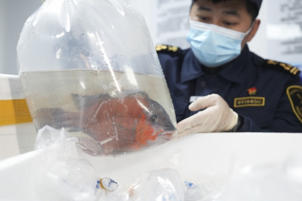 3月16日,产自非洲的800余尾慈鲷科观赏鱼,包括萨伊蓝、红龙王、金头虎、双星蝴蝶等品种,从埃塞俄比亚首都亚的斯亚贝巴搭货运航班,飞抵长沙黄花机场。这是湖南口岸首次进口非洲观赏鱼。图为海关关员正在对观赏鱼进行单证审核和检疫查验。