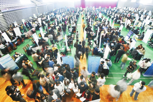 3月19日,中南林业科技大学体育艺术馆,大学生在参加招聘。当天,共青团湖南省委实施的“湖南共青团促进大学生就业‘金桥行动’”暨“春启新程 职等你来”中南林业科技大学2025届毕业生大型供需见面会举行,240余家用人单位现场招聘。