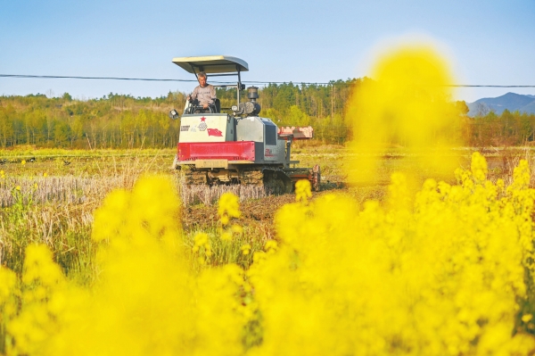 3月22日,资兴市蓼江镇蓼江村,农民驾驶农机翻耕农田,为早稻插秧做准备。近期,该市农民抢抓农时开展春耕备耕,田间地头一片忙碌景象。