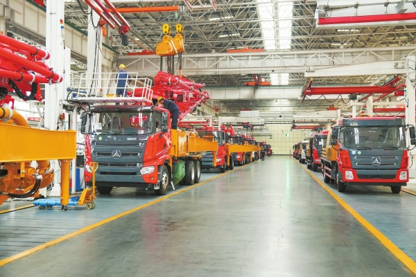 3月23日,长沙经开区三一重工18号厂房智能化制造车间,工人在混凝土泵车装配线上忙碌。近期,长沙各工程机械制造企业迎来生产旺季,开足马力赶订单。