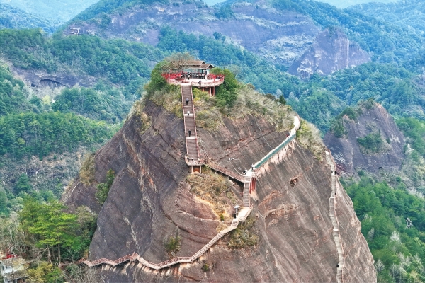 3月22日,通道侗族自治县万佛山景区,游客在丹霞峰林间漫步。近年来,当地着力挖掘、有效利用特色生态资源,推进生态与旅游协同发展。