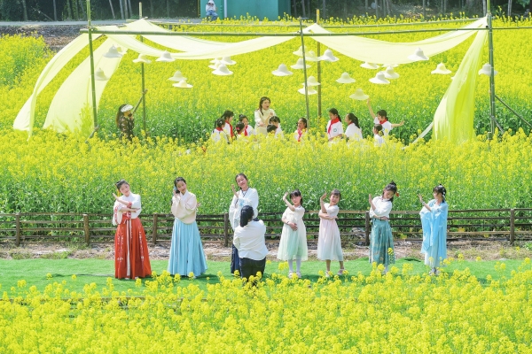 3月25日,浏阳市高坪镇南车湾油菜花田,潭花完小的学生在上诗朗诵和美术课。当天,该校将课堂搬到了田野,学生们在花海中体验音乐、美术、语文等课程,沉浸式体验跨学科美育课堂。