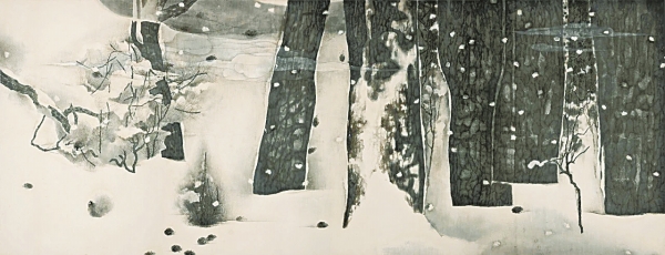 朱训德的《冬语》以一种简约的现代形式,借一小景却能建构宏大天地,以一种高古典雅的方式和遥远的宋式美学相呼应,雪色苍茫中透着灵动。那些看似随意的墨痕,既延续了古人写意的洒脱,又通过层层渲染让画面有了现代感,就像给传统水墨注入了湖南人特有的温厚与哲思。