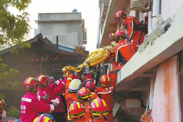 图为当日,在缅甸曼德勒,中国救援队伍救出这名幸存者。