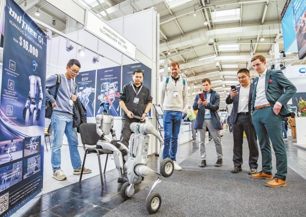 图为4月1日,在德国汉诺威工业博览会上,人们在中国宇树科技展区观看机器狗演示。