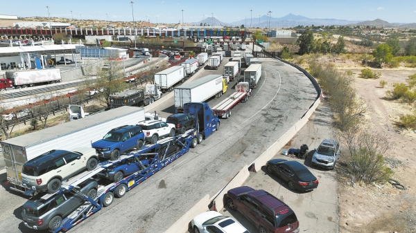 美国总统特朗普此前宣布的对进口汽车加征25%关税的措施4月3日正式生效。图为4月2日,在墨西哥索诺拉州诺加莱斯市,一辆装载多辆汽车的运输车(下中)行驶在墨美边境附近的公路上(无人机拍摄)。