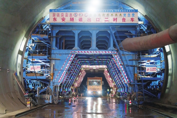 4月7日,永州市邵永铁路东安隧道施工现场,工人在抓紧施工。当天,由中铁二十五局承建的邵永铁路东安隧道掘进突破1000米大关,为隧道顺利贯通奠定了坚实基础。东安隧道全长5562.09米,是邵永高铁全线最长隧道。