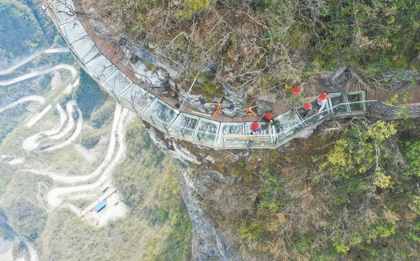4月8日,施工人员在更换玻璃栈道的玻璃。当天,张家界天门山景区对盘龙崖玻璃栈道的27块玻璃进行更换,为游客提供更加安全、舒适的旅游体验。