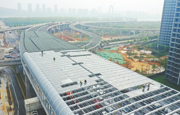 4月9日,长沙兴联路大通道(过江段)项目河西段,工人在安装声屏障。该项目是长沙在建桥面最宽、单跨最大、桥长最长的过江大桥,是长沙北部城区新增的一条进出城快捷通道。过江段项目河东、河西两侧分布有多个居民小区,安装声屏障将有效减少交通噪声对居民的影响。目前,该项目施工已进入扫尾阶段,即将达到通车条件。