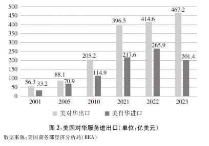 美国服务业产业门类齐全,具有较强国际竞争力。总体来看,随着经济不断发展和人民生活水平提升,中国对服务需求明显扩大,中美双方服务贸易快速增长。据美国商务部统计,2001-2023年,中美服务贸易额由89.5亿美元扩大到668.6亿美元,增长了6倍(图2)。根据中方统计,2023年,美国是中国第二大服务贸易伙伴;据美方统计,中国是美国第五大服务出口目的地。