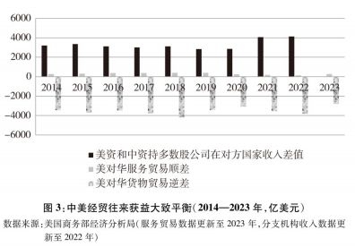 根据美国商务部数据,2023年美国对华服务贸易顺差为265.7亿美元,美国在服务贸易方面占有显著优势;2022年美资企业在华销售额高达4905.2亿美元,远高于中资企业在美786.4亿美元的销售额,差额高达4118.8亿美元,美国企业跨国经营优势更为突出。