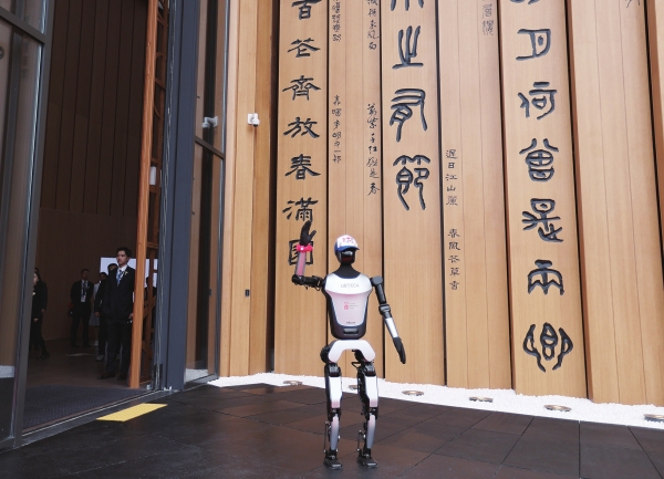 图为当日,人形机器人在中国馆外向嘉宾招手致意。