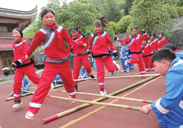 4月14日,保靖县碗米坡小学,学生在阳光大课间跳竹竿舞。今年,该校开展“多彩大课间 快乐又健康”主题活动,通过跳竹竿舞、武术操、跳绳等活动,丰富校园文化生活,增强学生身体素质。
