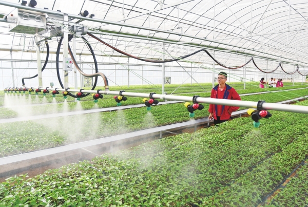 4月14日,嘉禾县珠泉镇湘溪村辣椒培育基地,农技人员在操作智能化浇灌系统喷淋辣椒苗。近年来,该县大力发展蔬菜产业,推广普及智能化育苗,提升蔬菜质量,促进农业产业增收增效。