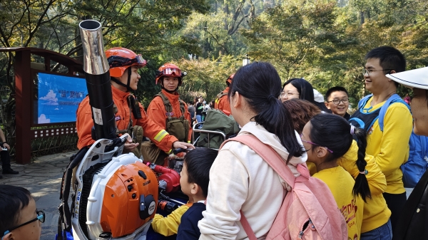 4月4日,国家消防救援局湖南机动队伍在岳麓山风景区面向游客开展森林防火安全科普。