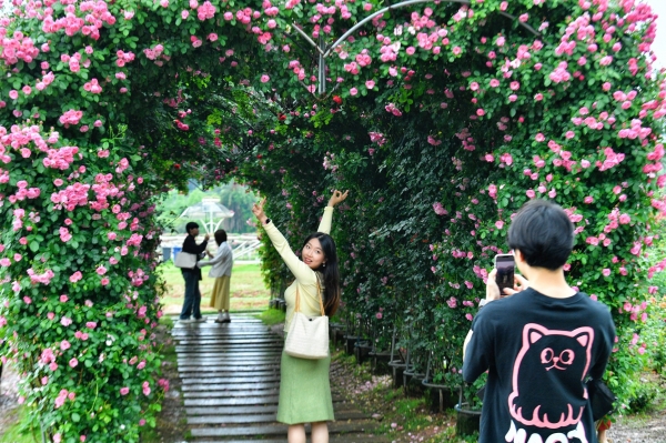 4月24日,湖南省植物园世界名花广场,游客在月季花海中赏花留影。目前,该园140多个品种3万余株月季花竞相绽放,如诗如画,氛围感满满,吸引许多游客打卡。