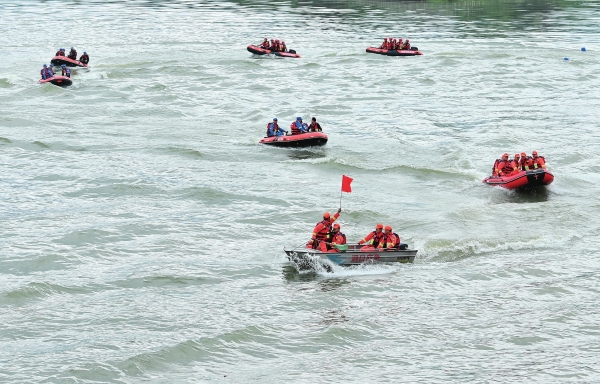 4月24日,平溪江洞口县文昌街道段,应急救援队员驾驶橡皮救生艇进行水上救援演练。当天,该县举行防汛抗洪应急救援综合演练,通过模拟演练搜救落水人员、淹溺急救、转移受困群众等课目,检验和提升防汛应急队伍的实战能力。