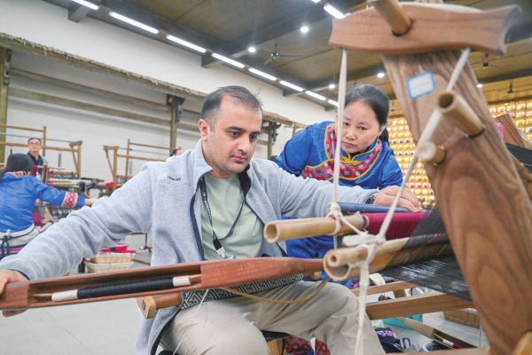 海外游客体验土家族织锦技艺