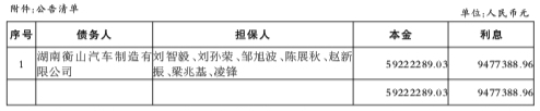 注:1、本公告清单所列本次进行转让的贷款本金余额截止时间为2024年11月28日,2024年11月28日(含)之前债务人及担保人拖欠的利息、复利、罚息、相关生效法律文书项下的迟延履行金,2024年11月28日(含)之后新产生的欠息、复利、罚息、相关生效法律文书项下的迟延履行金,亦均包含在本次转让范围内。借款人和担保人应支付给衡山经济开发区建设投资开发有限公司的利息、复利、罚息、迟延履行金等,按借款合同、担保合同、中国人民银行的有关规定,以及相关法律、法规、生效法律文书计算。2、若债务人、担保人因各种原因更名、改制、停业、吊销营业执照或丧失民事主体资格的,请相关承债主体或主管部门代位履行义务或者履行清算责任。3、清单中“担保人”包括保证人、抵押人、出质人。