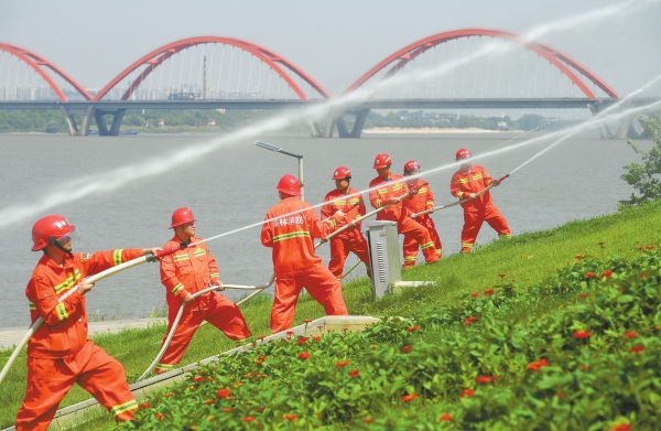 5月12日,参演人员在进行防火演练。当天是第17个全国防灾减灾日,湖南省“5·12全国防灾减灾日”集中宣传演练活动在长沙滨江文化园举行。本次活动由省应急委员会办公室、省应急管理厅联合主办,以“人人讲安全,个个会应急——排查身边灾害隐患”为主题,通过实战演练等形式,普及防灾减灾知识,提升全民应急能力。