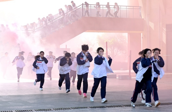 5月12日,洞口县文昌街道思源实验学校,学生在模拟火灾现场进行应急疏散演练。
