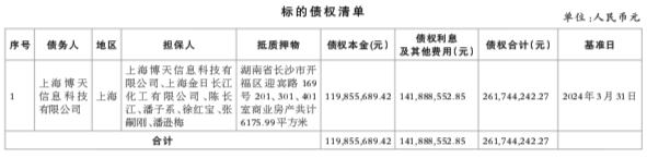 长沙湘江资产管理有限公司将于2025年5月29日10:00时起至2025年5月30日10:00时止(如发生自动延时的,截止时间以延长后的结束时间为准)在阿里资产竞价网络平台上(网址http://zc-paimai.taobao.com)对上海博天信息科技有限公司债权资产进行公开挂牌竞价,本次拟处置的资产截至转让基准日2024年3月31日,该户债权本金余额119,855,689.42元,利息及其他费用总额合计141,888,552.85元,债权总额合计261,744,242.27元。债务人企业所在地为上海。其余竞价公告详情请登录阿里资产竞价网络平台进行查看。