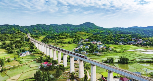5月23日,怀化市鹤城区黄金坳镇汪家村,高铁列车飞驰而过。张(家界)吉(首)怀(化)高铁被誉为湘西最美高铁,串起了我省张家界、芙蓉镇、凤凰古城等著名旅游景点。通车以来,极大改善了沿线群众出行条件,助力区域经济发展迈入了快车道。